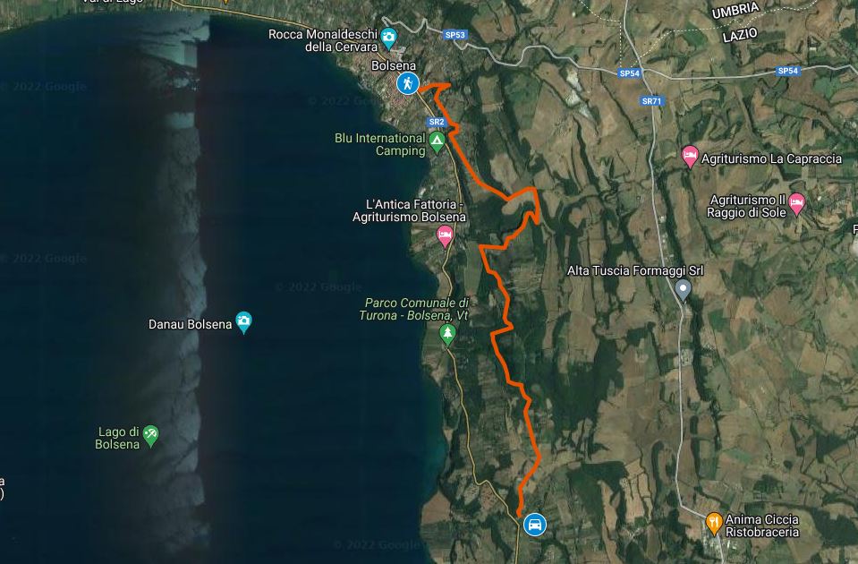 La via Francigena è lì, da secoli, e già il suo nome evoca avventura e odore di storia. Decidiamo di farne un tratto tra Bolsena e Montefiascone. Le informazioni che abbiamo dicono sia tra i più apprezzati del Lazio, però 15 km sono parecchi per i nostri ragazzi e già solo all’idea non tardano a manifestare una spiccata contrarietà. Ci organizziamo per farne qualcuno di meno, del resto anche il meteo pronostica pioggia nei paraggi. Per fortuna la ricca colazione migliora il clima generale e partiamo armati di ottimismo. E di ombrello.