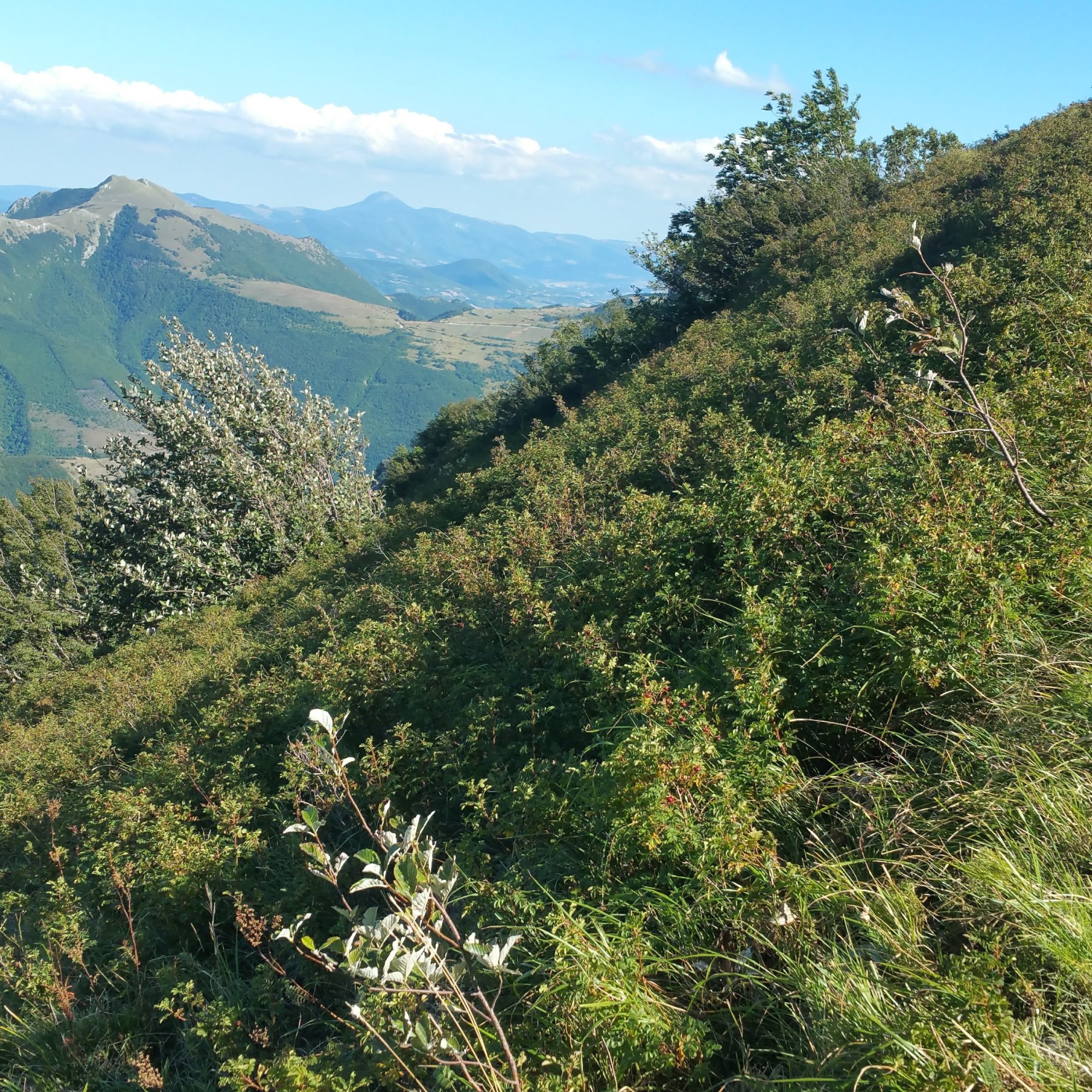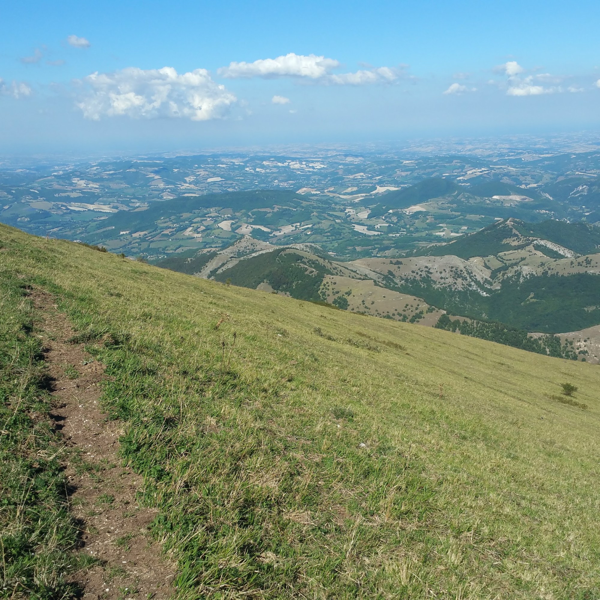 E’ una bella giornata di settembre con un sole gagliardo, ma sto salendo dal versante in ombra e cammino sotto le fitte chiome di un bosco molto suggestivo, molto silenzioso, ma anche piuttosto crepuscolare per essere rilassante. Incontro 3 ciclisti. Scendono anche loro, mentre io mi ostino a salire. Arrivo sulla carrareccia sommitale alle 15:30 e mancano alla cima ancora quasi 2 km e circa 200 metri di dislivello. Quassù è la stessa bella giornata di settembre in cui ero partito, la cima è lì, poco più in alto e mi offre il suo morbido profilo. Le persone che l’hanno già raggiunta sono ben visibili, si sentono le loro voci, non è lontano, si intuisce quanto siano tranquilli e rilassati, lassù, dove è sicuramente bello stare. Vedo che le loro auto sono qui, 200 metri sotto di loro. La mia no, è 800 metri più giù, ma di altitudine.