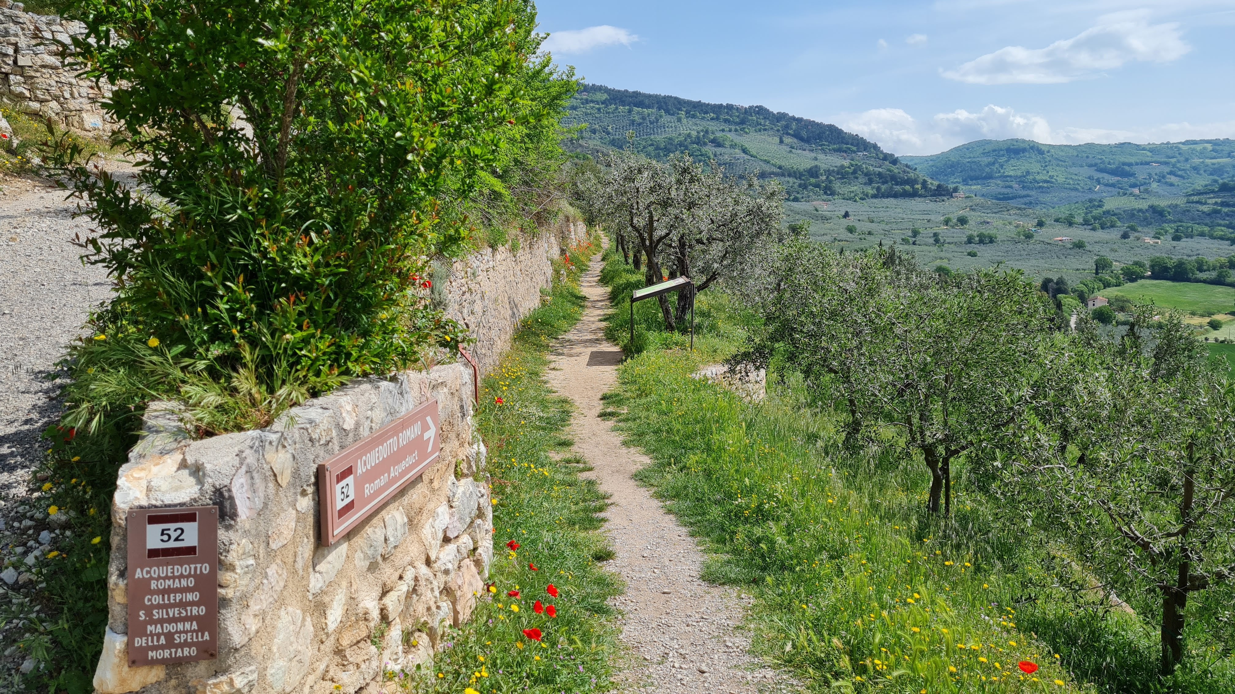No, non è spettacolare come gli acquedotti che alimentavano l’antica Roma all’apice del suo splendore, con le loro grandi arcate, ma ha il pregio di essere quasi integro, inserito in un contesto paesaggistico notevole. Sono compiaciuto dalla vista dell’opera in sé e dal panorama su Spello, incorniciato tra i rami degli olivi, con la sagoma di Trevi e il profilo di Montefalco in lontananza sopra la piana folignate. Sullo sfondo ci sono i Monti Martani e più a lato riconosco la profonda “V” della valle del Menotre delimitata dalla cuspide del monte di Pale. Il monte sulla sua cima ospita due antenne ma un tempo, al loro posto, sembra ci fosse un tempio umbro, ormai interamente cancellato dai secoli. Non ne è rimasto più niente e anche se intorno a me vedo tutta terra di antichi Umbri, l’impronta lasciata qui dai Romani è molto più marcata, non c’è niente da fare.