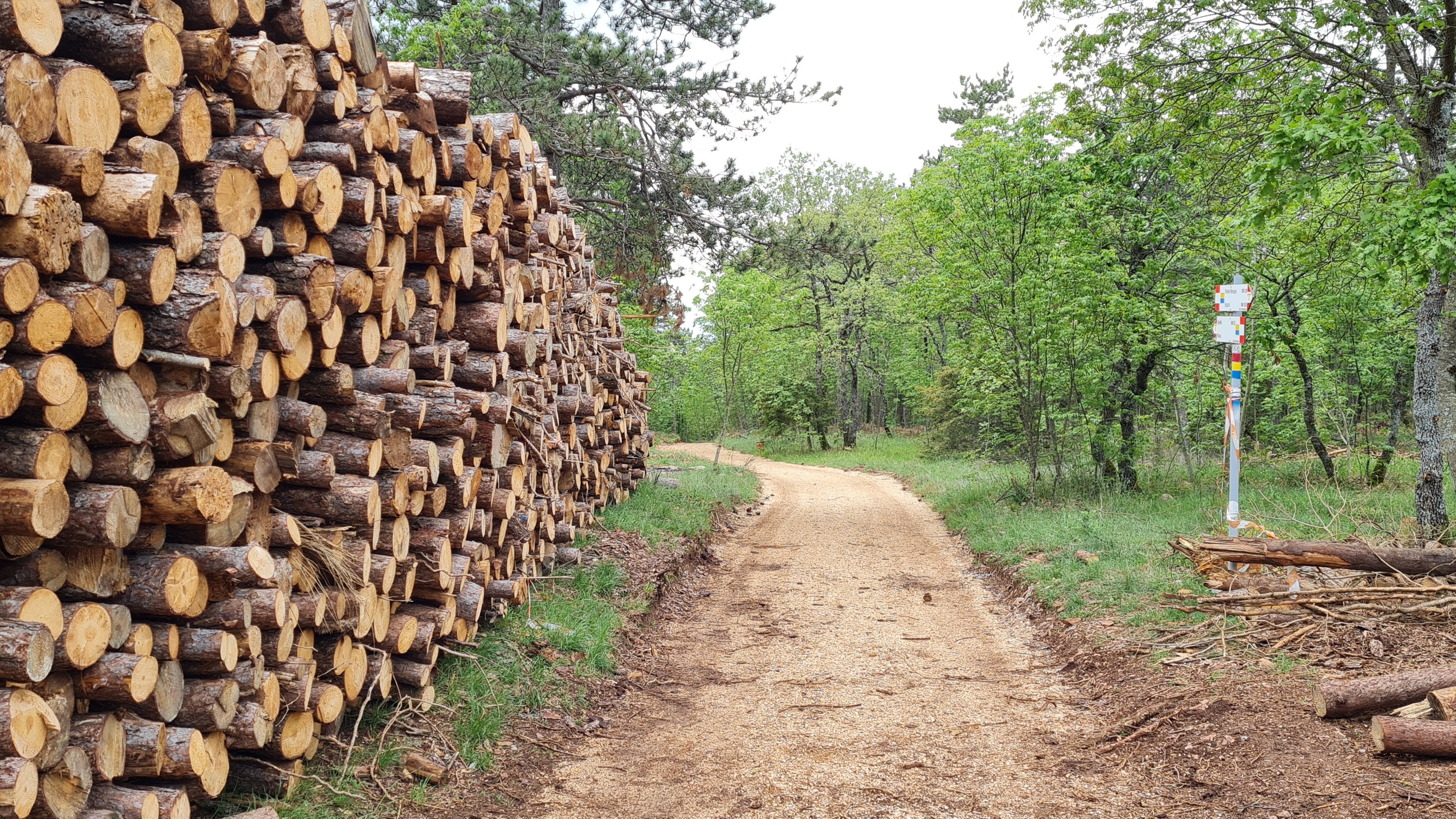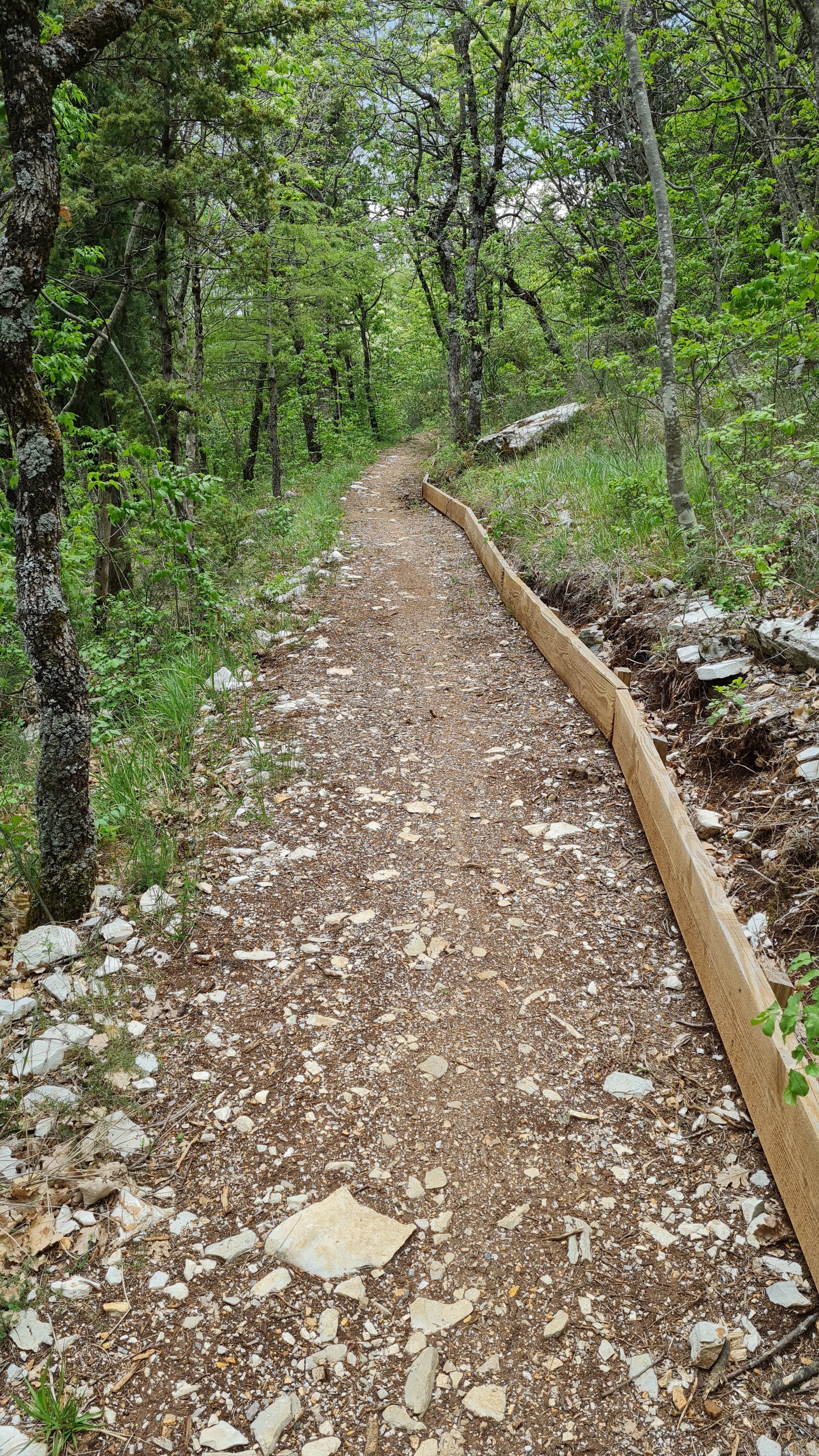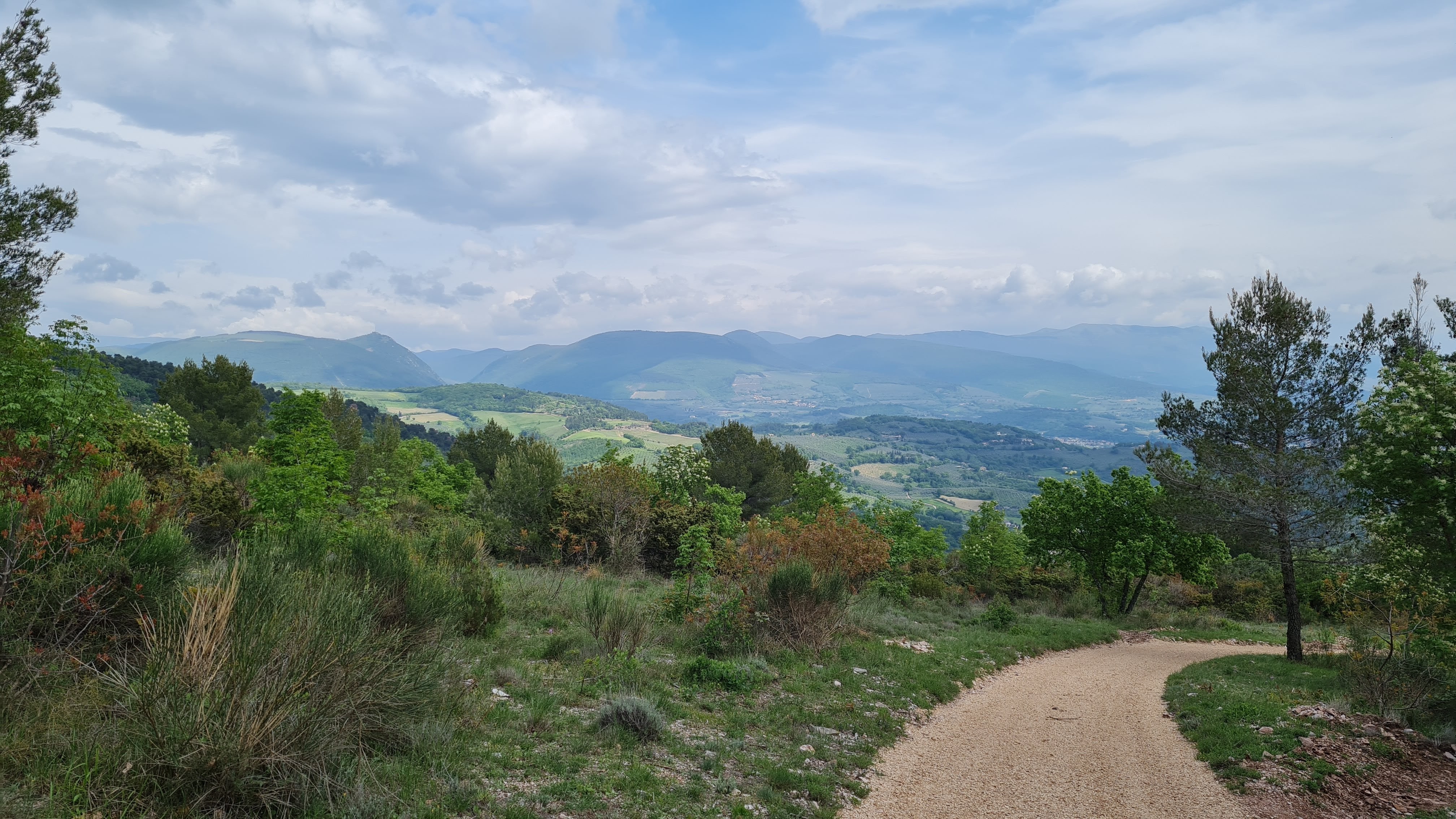 La discesa verso Spello è su una sentieristica larga e curata, ben segnalata, fatta di breccia battuta e livellata. Ampi tratti sono delimitati a monte da tavole di legno lunghe e strette, ci sono diversi punti sosta rimarcati da originali segnavia di cui non sentivo il bisogno e sono attrezzati con tavoli metallici, probabilmente più durevoli degli ormai classici tavoli in legno. L’insieme è certamente gradevole anche se, francamente, lo trovo un pò lezioso.